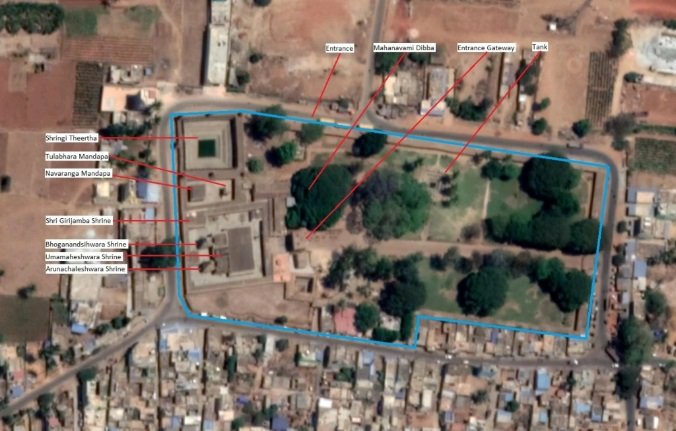 What is today known as Bhoga Nandishvara Temple actually comprises of a pair of main shrines built side by side. The north shrine is dedicated to Bhoganandishwara, the south shrine to Arunachaleshwara, each consisting of a garbhagriha, sukanasi, and navaranga.